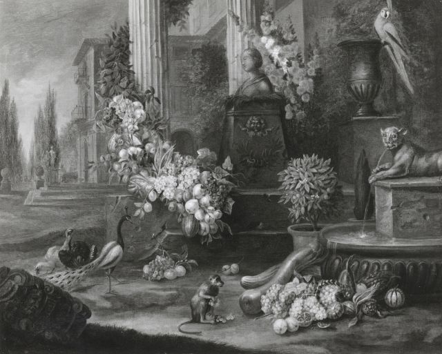 Anonimo falsario sec. XIX/ XX - Natura morta con fiori e frutta, scimmia, pavone e pappagallo