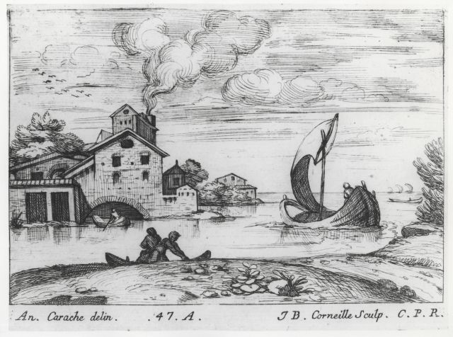 Corneille Jean Baptiste, Paesaggio fluviale con barche e figure