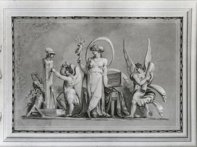 Apollo e Diana, Allegoria della Musica, Allegoria della Pittura, Allegoria dell'Architettura, Allegoria della Scultura, Segni zodiacali, Divinità, Motivi decorativi vegetali con putti alati, Motivi decorativi a cassettoni con rosette