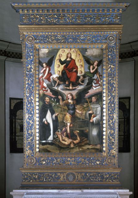 Raibolini Giacomo/ Raibolini Giulio, Cristo in gloria con san Michele Arcangelo, san Domenico, san Francesco d'Assisi