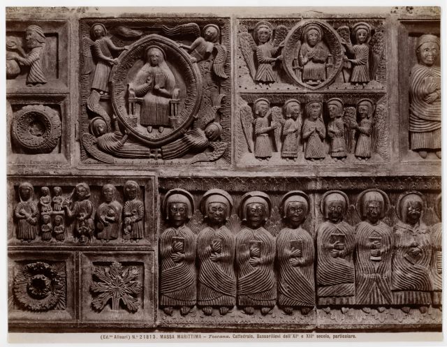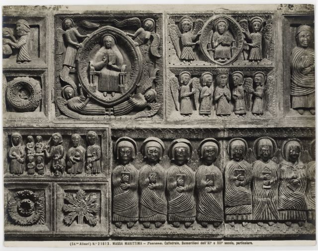 Anonimo toscano sec. XII, Cristo Redentore benedicente e angeli, Madonna incoronata dagli angeli, Elemosina, Apostoli