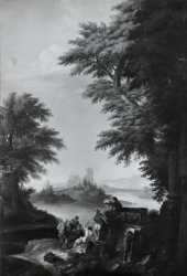Anonimo — Locatelli Andrea - sec. XVIII - Paesaggio con rovine classiche, fiume e figure