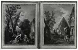 Vasari — Locatelli Andrea - sec. XVIII - Paesaggio con rovine classiche, fiume e figure; Paesaggio con rovine classiche, piramide Cestia e figure