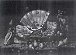 Anonimo — Anonimo spagnolo sec. XVII - Natura morta con fruttiera rotta con pere e ciliegie, insalata e scimmia
