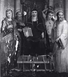 Anonimo — Pupini Biagio - sec. XVI - Santa Scolastica in trono tra san Giovanni Evangelista, sant'Antonio Abate, san Sebastiano e san Bernardo