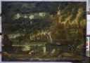 Anonimo — Roncelli Giuseppe (?) - sec. XVII/ XVIII - Marina in tempesta con porto, velieri e figureAnonimo