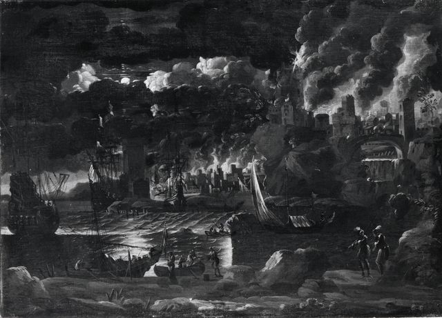 Roncelli Giuseppe (?) - sec. XVII/ XVIII - Marina in tempesta con porto, velieri e figure