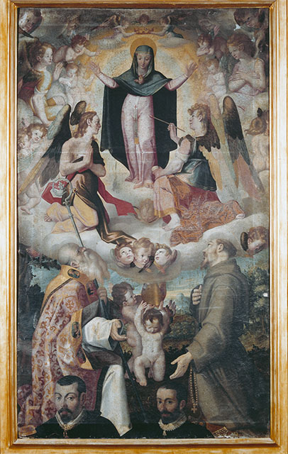 Rocchetti Marco Antonio - sec. XVI - Madonna dell'Angelo con santo vescovo, san Francesco d'Assisi, angeli e committenti