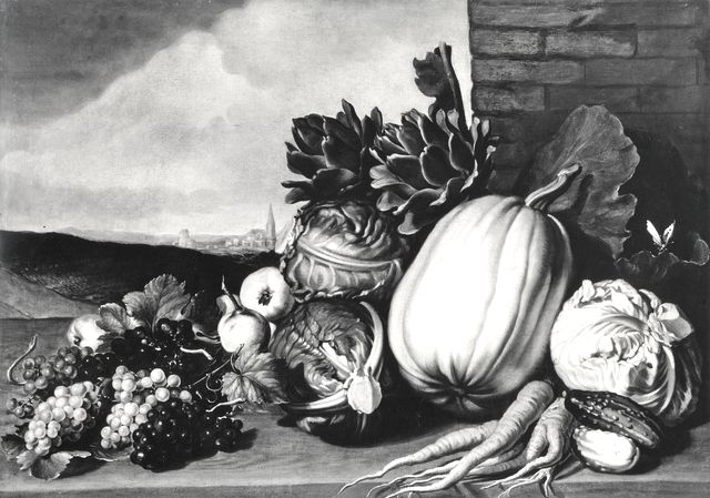 Studio Fotografico Perotti — Anonimo fiammingo sec. XVII - Natura morta con zucca, radicchi, carciofi, carote, uva e pereStudio Fotografico Perotti