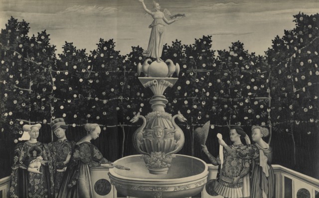 Collection Martin Le Roy. Seigneurs et dames dans un jardin. (Plateau d'accouchée). Ecole florentine, Xve siècle