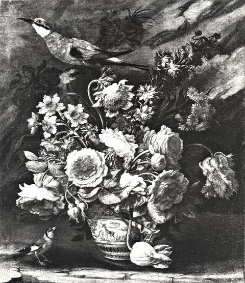 Anonimo — Scacciati Andrea - sec. XVII/ XVIII - Natura morta con vaso di fiori e uccelli Anonimo