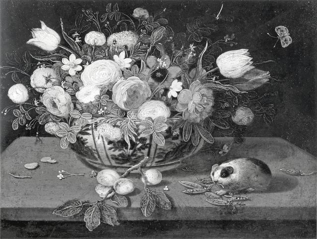 Golendorf, Pierre Kessel Jan van I - sec. XVII - Natura morta con vaso di fiori, ramo con prugne e porcellino d'India 1970-1974 gelatina ai sali d'argento/ carta baritata Golendorf, Pierre — Seghers Daniel - sec. XVII - Natura morta con vaso di fiori