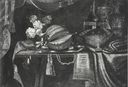 Natura morta con tappeto, cuscino, tenda, vassoio con melone e pere, fiori e oggetti metallici