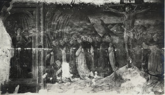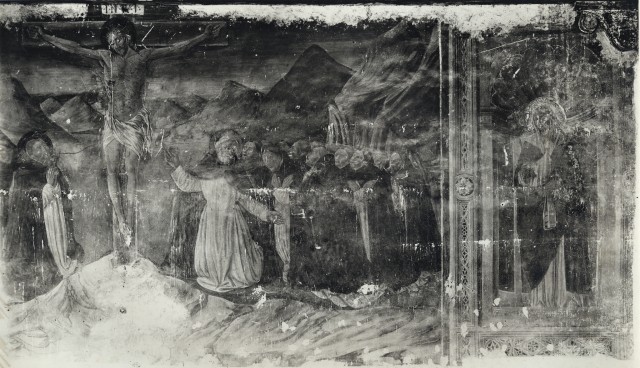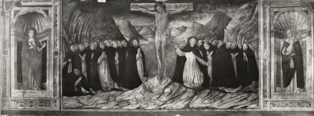 Istituto Centrale per il Catalogo e la Documentazione: Fototeca Nazionale Fabriano - S. Domenico. Antonio da Fabriano 1946-1975 gelatina ai sali d'argento/ carta baritata Stelluti, Roberto — Antonio da Fabriano - sec. XV - Cristo crocifisso tra san Domenico, san Pietro Martire e monaci domenicani