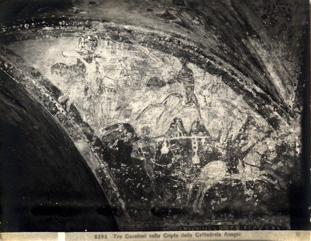 Cine Foto Laboratorio Colonna Castel S. Elia (Nepi) Affreschi dell'Apocalisse della Chiesa sotto il Santuario. 1950-1966 gelatina ai sali d'argento/ carta baritata Moscioni, Romualdo — Tre Cavalieri nella Cripta della Cattedrale Anagni