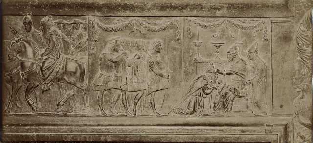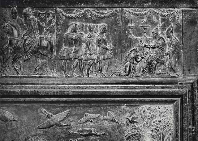 Anonimo Averulino Antonio - sec. XV - Portale della basilica di S. Pietro, battente sinistro: Incontro di Antonio Rido con l'imperatore Sigismondo e papa Eugenio IV 1961-1975 gelatina ai sali d'argento/ carta baritata Anonimo — Averulino Antonio - sec. XV - Portale della basilica di S. Pietro, battente sinistro: Incontro di Antonio Rido con l'imperatore Sigismondo e papa Eugenio IV