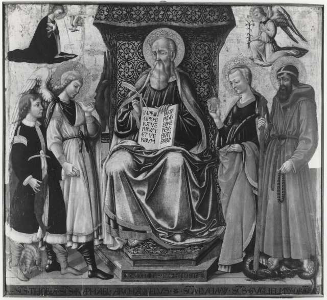 Neri di Bicci — San Giovanni Evangelista in trono tra san Raffaele Arcangelo e Tobia, santa Lucia e san Gugliemo di Malavalle, AnnunciazioneNeri di Bicci