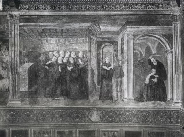 Maestro della Badia Morronese (Maestro della cappella Caldora) — San Benedetto benedice il vino avvelenato, San Benedetto esorcizza un monaco Maestro della Badia Morronese (Maestro della cappella Caldora)