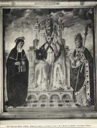 Alinari, Fratelli — Genova - Chiesa di S. Teodoro. S. Ambrogio in trono, ai lati S. Monica e S. Agostino. (Luca Baudi di Novara).