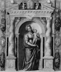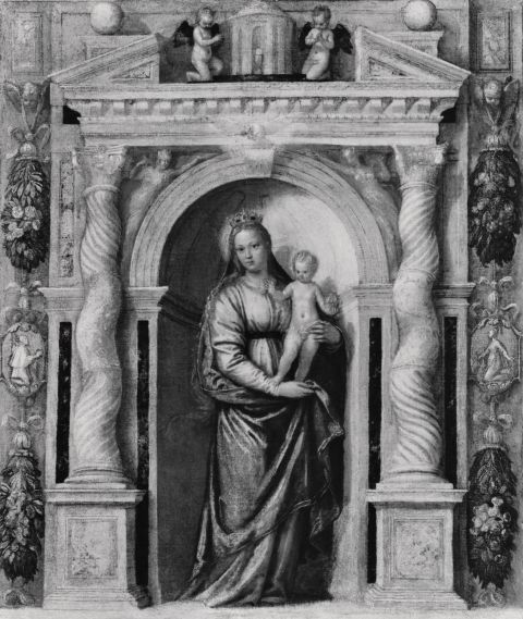 Anonimo — Caliari Paolo - sec. XVI - Madonna con Bambino entro finta nicchia architettonica