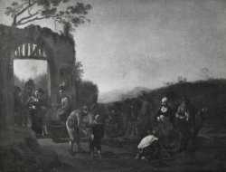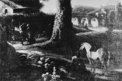Anonimo — Cerquozzi Michelangelo; Angeluccio - sec. XVII - Paesaggio con sosta di cavaliere e figure