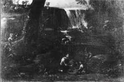 Anonimo — Cerquozzi Michelangelo - sec. XVII - Paesaggio fluviale con gentildonne e pastori