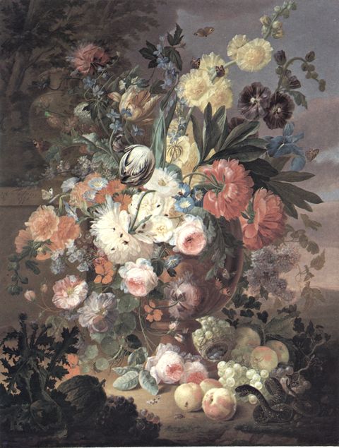 Anonimo — Fredriks Johannes Hendrick - sec. XVIII - Natura morta con vaso di fiori, frutta e vipera