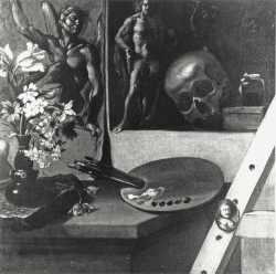 Anonimo — Cioci Antonio - sec. XVIII - Natura morta con vaso di fiori, tavolozza, statua, rilievo e teschio