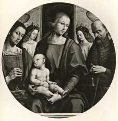 Anonimo umbro sec. XV/ XVI — Madonna con Bambino tra san Giovanni Evangelista, sant'Antonio Abate e angeli