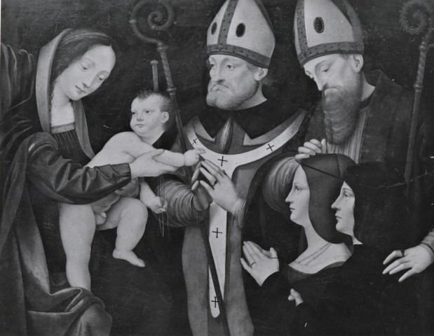 Anonimo lombardo sec. XVI — Madonna con Bambino, santi vescovi e devoti