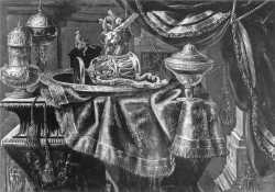 Manieri Carlo — Natura morta con argenteria, vaso di biscotti, tappeti e tende