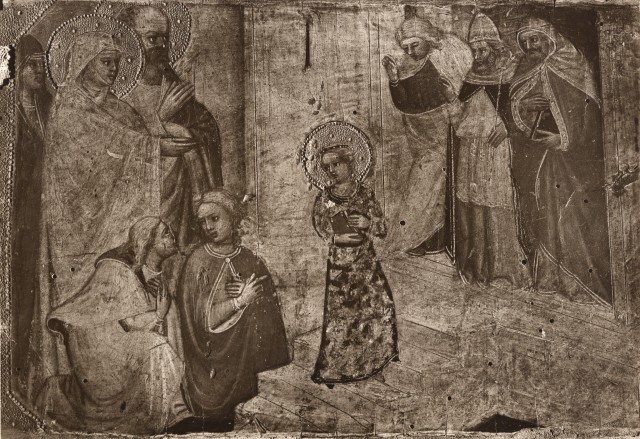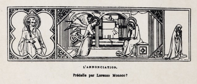 Anonimo — Ventura di Moro (Pseudo Ambrogio di Baldese) - sec. XV - Incisione al tratto della predella con l'Annunciazione e san Benedetto Anonimo
