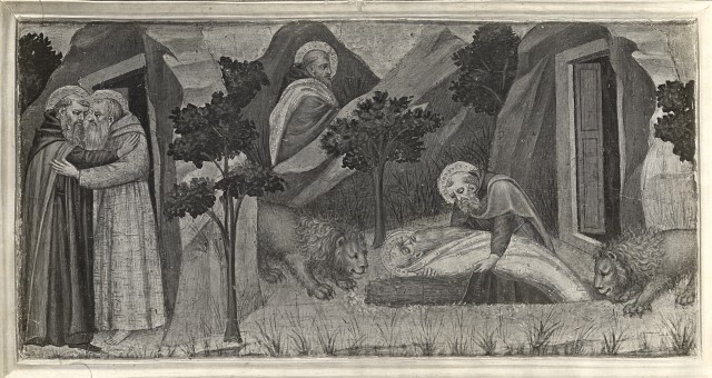 Ventura di Moro (Pseudo Ambrogio di Baldese) - sec. XV - Sant'Antonio Abate visita san Paolo primo eremita nel deserto; Sant'Antonio Abate seppellisce san Paolo primo eremita aiutato da due leoni