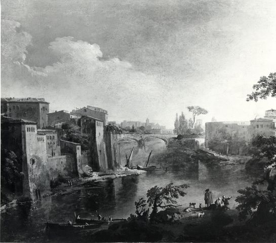 Anesi Paolo - sec. XVIII - Paesaggio con fiume, città e figure