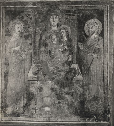 Anonimo romano sec. XIV - Sant'Anna con la Madonna e Gesù Bambino tra san Giovanni Evangelista e sant'Ambrogio