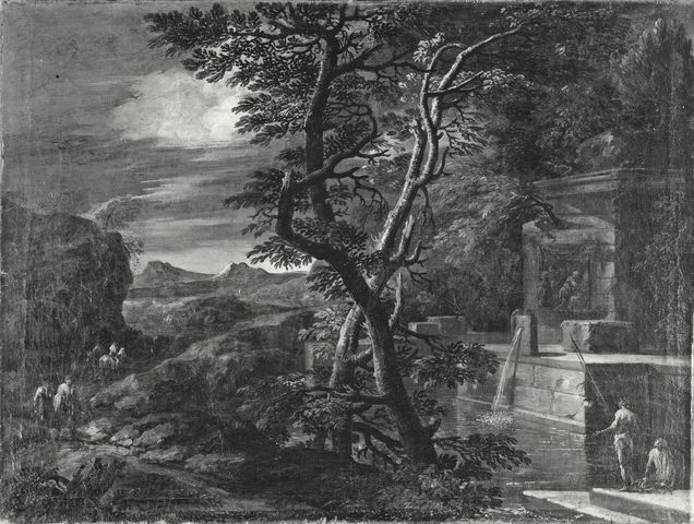 Istituto Centrale per il Catalogo e la Documentazione: Fototeca Nazionale — Rosa Salvator - seguace - sec. XVII - Paesaggio con fontana e figure Istituto Centrale per il Catalogo e la Documentazione: Fototeca Nazionale