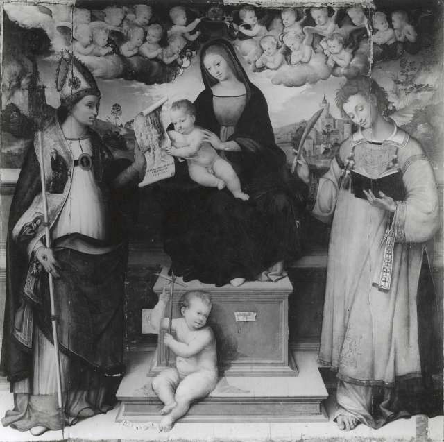 Archivio fotografico della Soprintendenza per i Beni architettonici e il paesaggio e per il patrimonio storico, artistico e etnoantropologico per le province di Lucca e Massa Carrara — Agostino Marti, Madonna col Bambino, San Giovannino, San Paolino e San Lorenzo (?). Lucca, Museo Nazionale di Villa Guinigi.