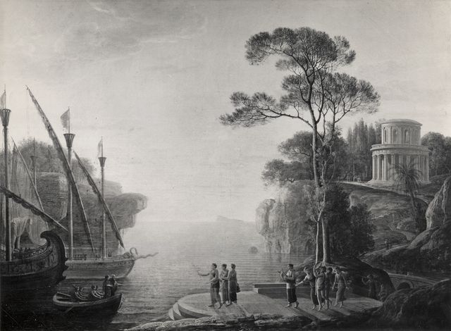 Gellée Claude (Claude Lorrain), seguace — Marina con sbarco di Enea sulle coste laziali (?)Gellée Claude (Claude Lorrain), seguace