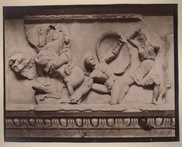 Foto sup 2991, verso del supporto secondario: nota anonima manoscritta: "British Museum. Mausoleum Room. Eastern side of frieze of monument. Combat between Greeks and Amazons. The young nude warrior is very fine; by Scopas; N. 8. Fr. + Wolt. N. 1230 and other".