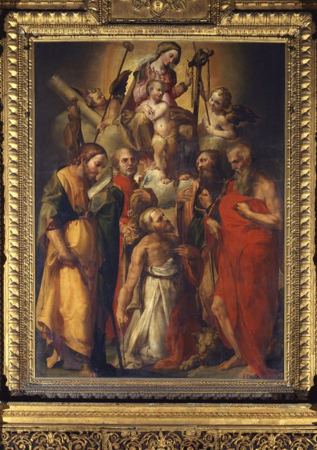 Bezzi Giovanni Francesco, Madonna con Bambino in gloria con il beato Ranieri, san Giacomo Maggiore, san Pietro, san Paolo, san Girolamo