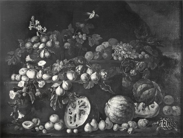 Autore non indicato, Natura morta con frutta, fiori e tartaruga